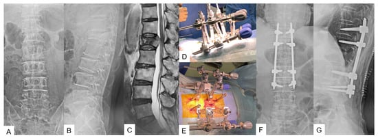 Case 3, 73-year-old male, L1 osteoporotic vertebral fracture, T11-L3 percutaneous posterior reduction. (A) Preoperative anteroposterior radiogram, (B) Preoperative lateral radiogram, (C) Preoperative T2 weighted MR imaging, (D,E) Intraoperative image, (F) Preoperative anteroposterior radiogram, (G) Postoperative lateral radiogram.