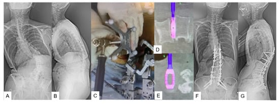 Case 6, 73-year-old female, Adult spinal deformity, L1-S1 OLIF and T10-pelvis posterior fusion. (A) Preoperative posteroanterior radiogram, (B) Preoperative lateral radiogram, (C) Intraoperative image, (D,E) Navigation monitor, (F) Preoperative posteroanterior radiogram, (G) Postoperative lateral radiogram.