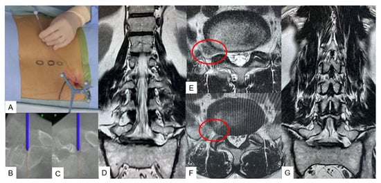 Case 7, 55 M, right L5/S foraminal disc herniation, transforaminal discectomy with navigation, (A) Intraoperative image, (B) Sagittal navigation image, (C) Coronal navigation image, (D) Preoperative coronal T2 weighted MR imaging, (E) Preoperative axial T2 weighted MR imaging, (F) Postoperative axial T2 weighted MR imaging, (G) Postoperative coronal T2 weighted MR imaging.