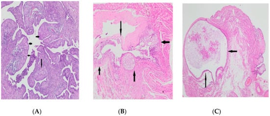 - Kurman, R.J.; Vang, R.; Junge, J.; Hannibal, C.G.; Kjaer, S.K.; Shih, I.M. Papillary tubal hyperplasia. The putative precursor of ovarian atypical proliferative (borderline) serous tumors, noninvasive implants, and endosalpingiosis. Am. J. Surg. Pathol. 2011, 35, 1605. [Google Scholar] [CrossRef]