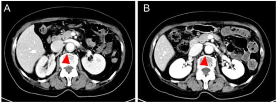 Contrast-enhanced CT at onset of disease (day 24 after vaccination) in 2021 (A) showed thickening of the aortic vessel wall (arrows). Contrast-enhanced CT on day 22 of treatment (day 63 after vaccination) (B) showed improvement in thickening of the aortic vessel wall (arrows).