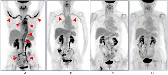- Blockmans, D.; de Ceuninck, L.; Vanderschueren, S.; Knockaert, D.; Mortelmans, L.; Bobbaers, H. Repetitive 18F-fluorodeoxyglucose positron emission tomography in giant cell arteritis: A prospective study of 35 patients. Arthritis Rheum. 2006, 55, 131–137. [Google Scholar] [CrossRef] [PubMed]