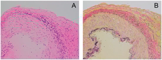 Temporal artery biopsies showed no giant cells, but the adventitia showed mild to moderate infiltration with inflammatory cells, mainly lymphocytes and histiocytes. (A) Hematoxylin and eosin staining; (B) Verhoeff–Van Gieson elastic staining; magnification: ×100.