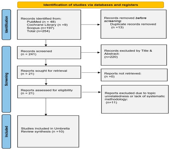Our literature search yielded a total of 269 relevant articles. Ten SRs fulfilled our eligibility criteria and were included in the review, with 7 of those conducting meta-analysis of the data [13,14,22,23,24,25,26,27,28,29]. The study selection process is depicted by the flow diagram (Figure 1).