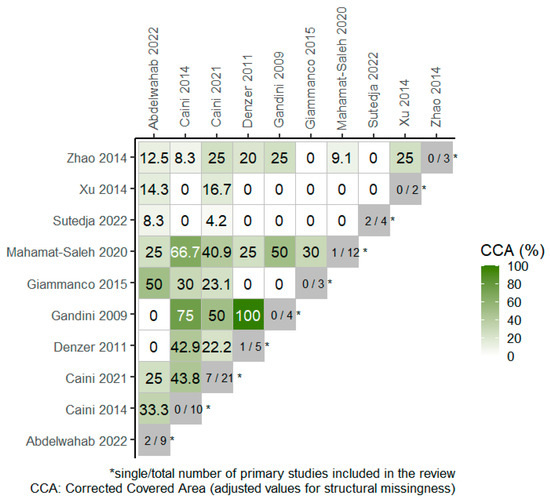 Overall, 4 RCTs were included in 4 out of the total 10 SRs, included in the overview, as portrayed in the citation matrix (Table S2). The degree of overlap of primary studies across the SRs, based on the overall corrected covered area (CCA) was 15.1% and 23.6% when chronological structural missingness was considered, which indicates high overlap among studies. The heatmap in Figure 2 presents the degree of overlap between pairs of SRs where the CCA values have been adjusted for structural missingness.