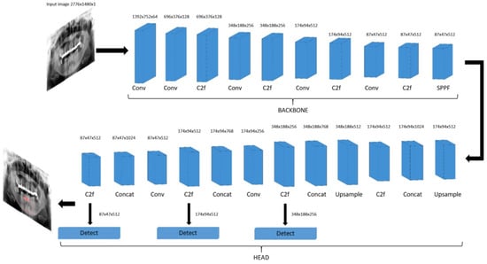 Figure 2. The model is composed of two key components: the “backbone” and the “head”. The backbone is responsible for extracting crucial features from input images which are then used by subsequent layers to perform specific tasks. The backbone is essentially a series of convolutional layers (Conv) that conducts two-dimensional convolution operations, implements batch normalization and uses SiLU as an activation function. At the end of the backbone, the spatial pyramid pooling layer (SPPF) aggregates features of different scales into a fixed-size feature map.