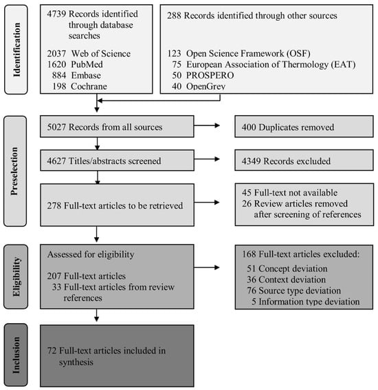 This scoping review was conducted in accordance with the JBI methodology for scoping reviews []. The corresponding protocol was registered in advance in the OSF database (Registration DOI: 10.17605/OSF.IO/TSZ28) and published [,]. The presented report of findings follows the Preferred Reporting Items for Systematic Reviews and Meta-Analyses Extension for Scoping Reviews (PRISMA-ScR) []. A corresponding PRISMA checklist for scoping reviews can be found in the Supplementary Materials.
