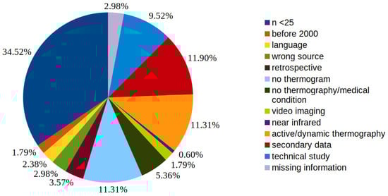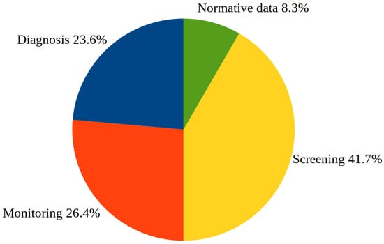 Thermography is intended to detect (screen), determine (diagnose), observe, and/or evaluate (monitor), among other things, the state of disease and health. A fourth category specific to this work is the assessment of reference values, i.e., normative data. The different categories are visualized with a pie chart in Figure 3.