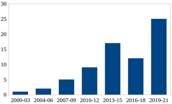 The included studies were conducted in the Americas, Asia, and Europe, with India, the USA, China, the UK, and Italy being the most frequently represented countries in descending order. Looking at the included references in terms of their number and year of publication, an increase over time is evident with a peak in 2020/21 with 23 publications. Figure 5 provides an overview of the distribution of publication numbers of the included references summarized in time units of three years.