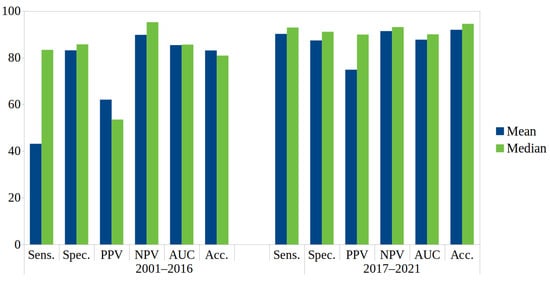 The data on diagnostic quality were very heterogeneous. Median sensitivity was 87.1 (min 25.0, max 100, n = 41), specificity 87.2 (min 50.8, max 99.2, n = 40), PPV 72.2 (min 5.7, max 97.4, n = 21), NPV 93.3 (min 61.5, max 100, n = 22), AUC 86.2 (min 59.0, max 97.1, n = 29), and accuracy 89.7 (min 50.2, max 96.3, n = 14). Figure 7 visualises the respective data on diagnostic quality in the included studies divided into a time period from 2001 to 2016 and a more recent period from 2017 to 2021.