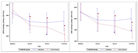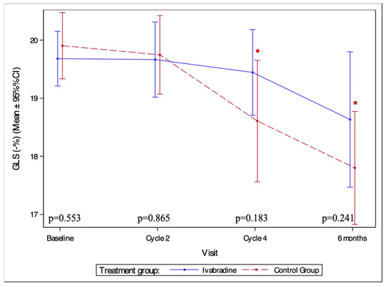 In the ivabradine group, GLS has not significantly changed from the baseline. In contrast, a significant decrease in GLS was observed in the control group after four AC cycles and at 6 months follow-up compared to baseline (p = 0.023 and p < 0.001, respectively) (Figure 4).