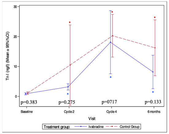 Levels of troponin I during the study period. Tn I—troponin I; *—statistically significant difference compared to baseline (p < 0.05).