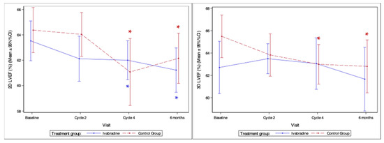 Changes of left ventricular ejection fraction. 2D—two-dimensional; 3D—three-dimensional; LVEF—left ventricular ejection fraction; *—statistically significant difference compared to baseline (p < 0.05).
