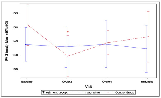 For RV dysfunction, no difference occurred across groups over the study period (p = 0.85). It was only in the control group that there was a significant reduction in S’ after two cycles of chemotherapy (p = 0.002) (Figure 7).