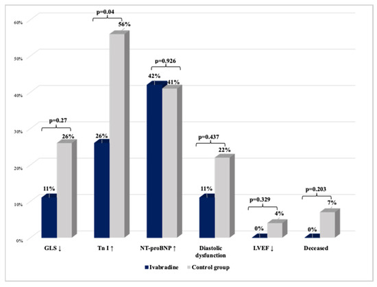 During the follow-up, elevation of Tn I was found in 20 patients (42%). Of these patients, five (24%) were in ivabradine and fifteen (56%) in the controls (p = 0.04).