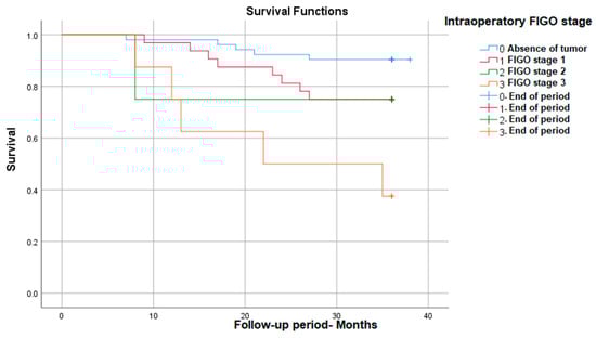 We also found that between the FIGO stages evaluated during the surgical intervention, there are statistically significant survival differences, with stage 3 having the lowest survival at 3 years (38%)—p (Log Rank) = 0.001 (Figure 2).