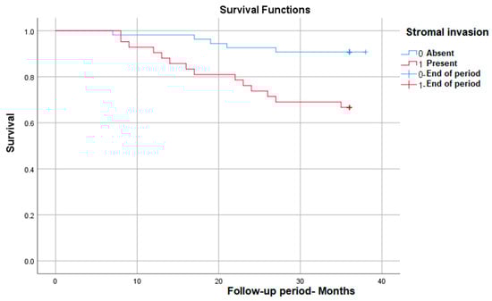 As we expected, stromal invasion is correlated with a significantly lower survival rate in those in which it is present, from nearly 93% in patients without invasion to 65% in those with invasion—p (Log Rank) = 0.003 (Figure 3).