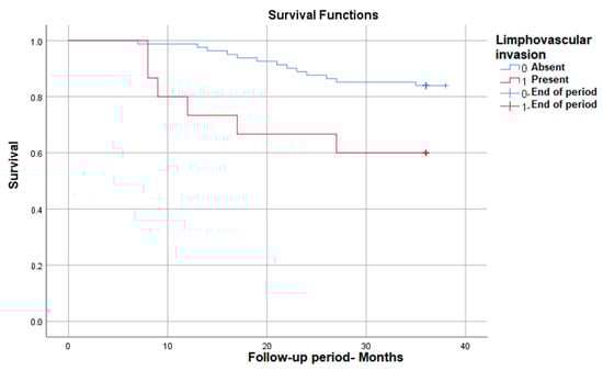Also, the lympho-vascular invasion correlates with significantly lower survival in those in which it is present, down to 60%—p (Log Rank) = 0.015 (Figure 4).