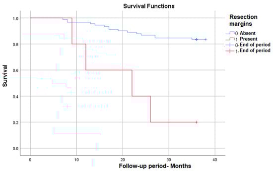 The status of the resection margins is also very important. According to the literature, negative margins are associated with increased survival [,]. This aspect was also confirmed in our study, and we also found that it represents an independent predictor factor. Being a preventable risk factor, the positivity of the resection margins can be avoided by using a careful surgical technique and an experienced team.