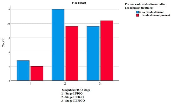 Using the Pearson’s chi-square test, we compared whether the frequency of the residual tumor differs according to the FIGO stages, and we did not obtain any statistically significant difference—p—0.644 (Figure 8).