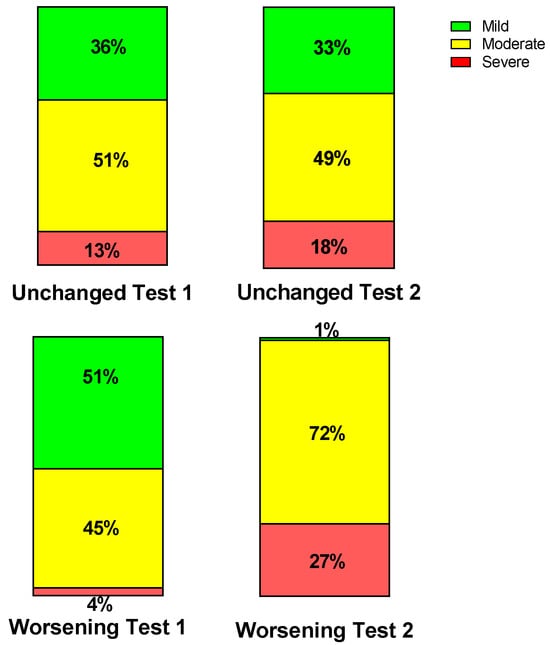 Percent severity per group per test according to International Consensus Criteria presented per test per group. The two stacked upper columns show the unchanged group and the two stacked lower columns the worsening group. The results of test one are on the left, and the right the results of test two are on the right.