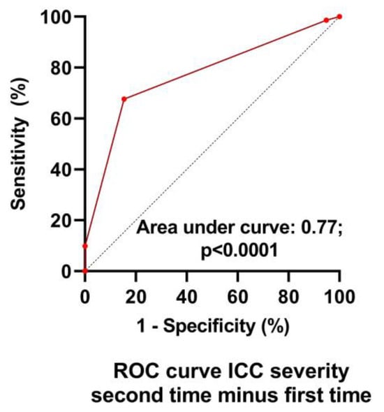 ROC analysis of the change in ICC severity scale to detect worsening symptoms. ICC: international consensus criteria of disease severity [].