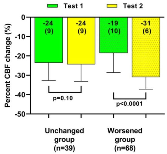 Percent cerebral blood flow change in both head-up tilt tests, comparing patients with a relatively stable clinical condition to those with a worsening condition. CBF: cerebral blood flow.