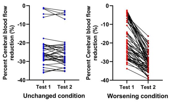 Percent cerebral blood flow individual changes in both head-up tilt tests comparing patients with a relatively stable clinical condition (blue) to those with a worsening condition (red). Unchanged condition meaning patients returning to patient care without a significant change in their clinical situation (blue; left sided panel) compared to worsening condition where patients returned for re-evaluation because of worsening symptomatology (red; right sided panel).