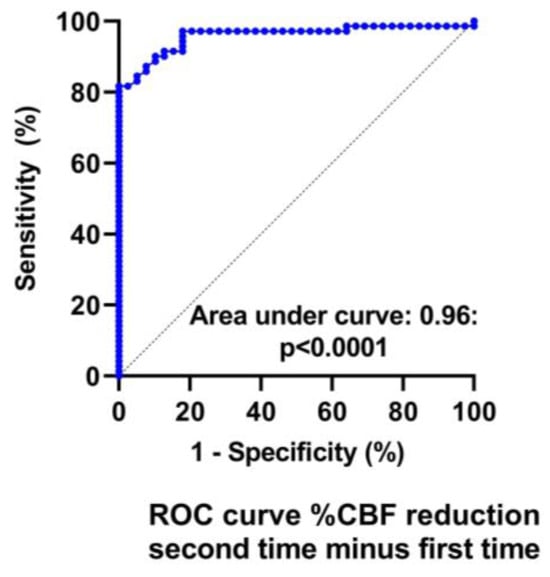 Table 3 and Table 4 show the hemodynamic results of the first and second tilt tests for the group with unchanged symptoms versus the one with worsening symptoms. The results of the first tilt test showed no differences between the two groups in HR, blood pressures, CBF, or the distribution of patients having a normal HR and blood pressure response, orthostatic hypotension (OH) or postural orthostatic tachycardia syndrome (POTS). The percentage reduction CBF was different but did not reach our conservative statistical significance of <0.01. Comparison of the two groups at the second tilt test showed no differences in HR, blood pressure, or CBF at baseline and at end-tilt. The percent reduction in CBF was significantly larger in the group with worsening symptoms (p < 0.0001). Figure 4 shows the percent reduction in CBF for both groups for both tilt tests, and Figure 5 shows the individual CBF data for both groups and tests. A ROC analysis showed that a further decrease in % CBF of −6% or more at the second tilt test was diagnostic for worsening of symptoms with a sensitivity of 82% and specificity of 97% both, with an area under the curve of 0.96, p < 0.0001 (Figure 6).