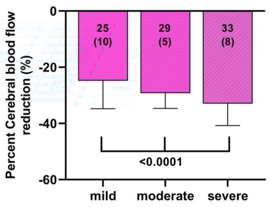 Finally, we combined the data of two previously published studies, where the ICC criteria were present but not mentioned in the reports [,]. Figure 7 shows that with increasing disease severity, the %CBF reduction was significantly larger: the %CBF reduction was significantly different between the three groups of mild, moderate and severe disease with p values ranging between p = 0.0073 and p < 0.0001.