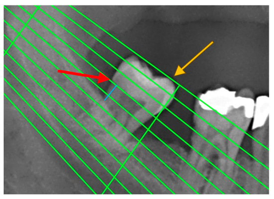 An example of measuring radiographic bone loss using a Schei ruler, where the red arrow indicates the line tangent to the cementoenamel junction, the yellow arrow indicates the line tangent to the highest point of the crown, and the blue line represents approximately 1.5 fields between the cementoenamel junction and the alveolar bone level.