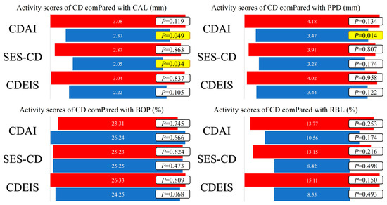 Average values of CAL, PPD, BOP, and RBL according to CD activity scores and statistical significance of the obtained values using the independent sample t-test (red—active disease; blue—remission; yellow—statistical significance (p < 0.05)).