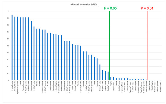 Differences in spectral power ratio between FTD and CTL (expressed as adjusted p value). The p value was adjusted after FDR correction using the Benjamini–Hochberg procedure at 2 s/10 step for FFT window length/step size per Hz. The green and red lines represent criteria of p < 0.05 and p < 0.01, respectively. FTD: frontotemporal dementia; CTL: control; FDR: false discovery rate; F: frontal; T: temporal.