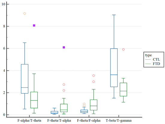 Distribution plot of each of the four spectral power ratios at 2 s/10 s with average referencing. A box-and-whisker plot is applied to present a statistical summary of each variable between the FTD and CTL groups. The blue and green boxes represent the CTL and FTD groups, respectively. The central box represents the values from the lower to the upper quartile (25 to 75 percentile). The middle line represents the median. The horizontal line extends from the minimum to the maximum value, excluding outside and far-out values which are displayed as separate points. The yellow and red hollow circle dots represent an outside value defined as a value that is smaller than the lower quartile minus 1.5 times the interquartile range, or larger than the upper quartile plus 1.5 times the interquartile range (inner fences). The purple solid rectangle dots represent a far-out value defined as a value that is smaller than the lower quartile minus 3 times the interquartile range, or larger than the upper quartile plus 3 times the interquartile range (outer fences). FTD: frontotemporal dementia; CTL: control; F: frontal; T: temporal.