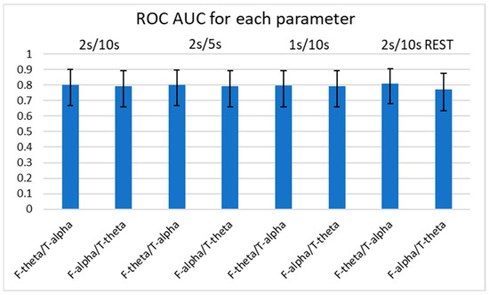 AUCs of ROC curves of F-theta/T-alpha and F-alpha/T-theta for each parameter. Error bars represent the 95% confidence intervals. No significant differences in AUCs between spectral power ratios or between parameters was found using Delong’s method. AUC: area under curve; ROC: receiver operating characteristic.