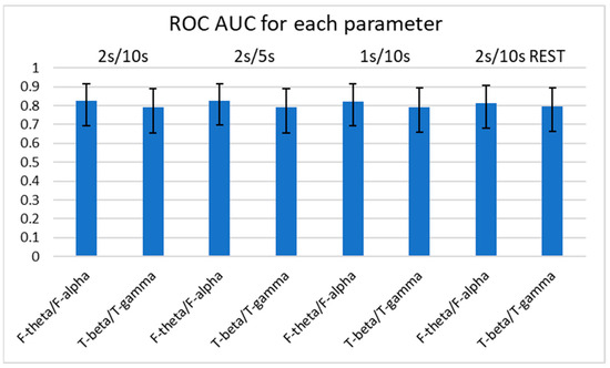 AUCs of ROC curves of F-theta/F-alpha and T-beta/T-gamma for each parameter. Error bars represent the 95% confidence intervals. No significant differences in AUCs between spectral power ratios or between parameters was found using Delong’s method. AUC: area under curve; ROC: receiver operating characteristic.