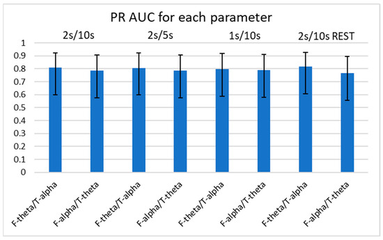 AUCs of PR curves of F-theta/T-alpha and F-alpha/T-theta for each parameter. Error bars represent 95% confidence intervals. No significant difference in AUC between spectral power ratios or between parameters was found using the logit method. AUC: area under curve; PR: precision recall.