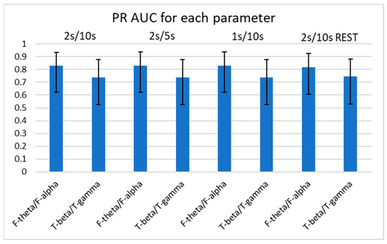 AUCs of PR curves of F-theta/F-alpha and T-beta/T-gamma for each parameter. Error bars represent 95% confidence intervals. No significant difference in AUC between spectral power ratios or between parameters was found using the logit method. AUC: area under curve; PR: precision recall.