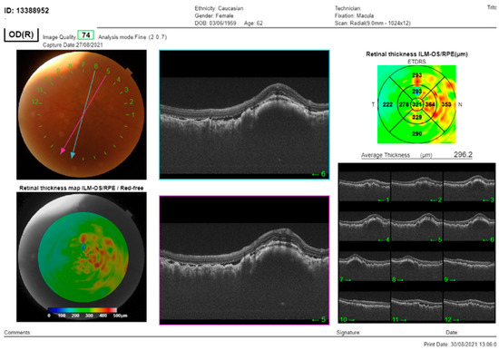 The SS-OCT (DRI OCT Triton, Topcon Co, Tokyo, Japan) showed choroidal thickening with overlying folds and subretinal fluid. OCT of the macula of the RE: cross-section through the lesion showed thickening of the choroid, with subretinal fluid and overlying folds of RPE.