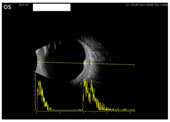 An ultrasound was performed on the left eye, revealing moderate internal reflectivity within the lesion and diffused thickening of the choroid. The B-scan provided detailed imaging, allowing for a thorough evaluation of the area (Figure 3).