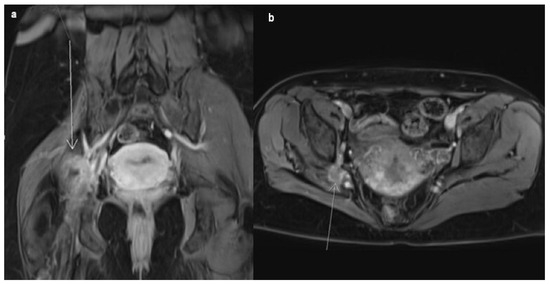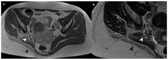 A 45-year-old female patient came to see a general practitioner because of a three-year-long mild and now exacerbating pain in her right leg, accompanied by a tingling sensation. She experienced weakness in her right leg and even more so in her right foot, with difficulty walking, which has now disrupted her daily life. Occasionally, in between regular menstrual bleedings that occurred every 28 days, she had been experiencing mild, 10-day-long extra-cyclical bleeding. Based on the presented symptoms, the patient was further examined by a neurologist, orthopedist, gynecologist, and neurosurgeon. The pain was first localized in the right gluteal region and then further spread through the posterior compartment of the whole leg. As mentioned, the pain was accompanied by upper-thigh tingling that also progressed downward to the foot. Assessing muscle strength during neurological examination, muscles on the right lower limb were found to be discretely weaker but able to contract and provide resistance. Moreover, when maximum resistance was exerted, the muscles were unable to maintain the contraction (graded 4+/5 muscle strength). The orthopedist’s examination yielded no noteworthy findings. The only gynecological symptom reported by the patient was intermenstrual bleeding. In terms of extra-cyclical bleeding, all diagnostic procedures were carried out in order to find the possible organic cause. Examinations of the patient’s hormonal status were also carried out. All findings were within physiological limits and ruled out the existence of organic and hormonal causes of intermenstrual bleeding, i.e., the existence of endometrial polyps, cervical polyps, submucosal myomas, and colposcopic lesions that can bleed, but also hormonal-cause and abnormal uterine bleeding in the middle of the cycle. Furthermore, the gynecologist reported normal results from the Pap smear and colposcopy. Transvaginal color Doppler ultrasound showed a uterus in a marked retroverted (RVF) position with inhomogeneous and irregular contours; showed multiple non-cavity-distorting myomas in its anterior wall, up to 5 cm in size; and ruled out the existence of lesions on the genital organs that could raise suspicion of pelvic endometriosis. The pain sensitivity of the tissue of the uterus, parametrium, and adnexal region was not determined by pelvic examination. All tumor markers (cancer antigen 125, carcinoembryonic antigen, cancer antigen 19.9), as well as inflammation markers (c-reactive protein, erythrocyte sedimentation rate), were within reference values. Therefore, magnetic resonance imaging (MRI) of the small pelvis was advised. Examination was performed using a 1.5-T scanner (Avanto fit, Siemens Medical Systems, Erlangen, Germany) with a master gradient system (45 mT/mpeak gradient amplitude, 200 m/T/s slew rate) and an eighteen-element array body surface coil and thirty-two element spine coil. The bladder with perivesical adipose tissue, the lineages of both ovaries, the parametrium with ischiorectal fossae, as well as the visible digestive tract and mesorectal and pararectal adipose tissue, were morphologically preserved, without any hiperintense solid or cystic endometriosis-like mass lesions. The body of the uterus was clearly demarcated by several intramural fibroids, with the largest one being the right anterior wall, measuring approximately 5 cm. None of the identified alterations has the potential to elucidate the neurological or gynecological symptoms observed in our patient. A minimal amount of free fluid was visible in the pelvis. It could be seen that the right gluteal group of muscles was atrophic, as in the right external obturator muscle compartment, and a vaguely demarcated heterogeneous formation was registered, transversely measuring approximately 30 mm and heterogeneously increasing the signal intensity post contrast. The whole formation was vaguely demarcated from the neurovascular pedicle, hence preventing the exclusion of the potential presence of an infiltrative lesion with an unknown cause (Figure 1).