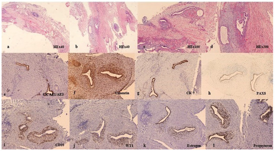Immunohistochemically, the glands were positive for CK AE1/AE3 (DAKO, Agilent, Santa Clara, CA, USA, Monoclonal Mouse Anti-Human Cytokeratin Clones AE1/AE3-M3515, dilution 1:100, pH6), CK7 (DAKO, Agilent, Santa Clara, CA, USA, Monoclonal Mouse Anti-Human Cytokeratin 7, Clone OV-TL 12/30/M7018, dilution 1:100, pH9), and PAX8 (Cell Marque, Rocklin, CA, USA, Mouse Monoclonal Primary Antibody PAX8, Clone MRQ-50/06523927001, Ready-to-Use, pH8); stromal cells were positive for CD10 (DAKO, Agilent, Santa Clara, CA, USA, Monoclonal Mouse Anti-Human CD 10, Clone 56C6/IR648, Ready-to-Use, pH 9), WT1 (DAKO, Agilent, Santa Clara, CA, USA, Monoclonal Mouse Anti-Human Wilms Tumor 1 Protein, Clone 6F-H2/IR055, Ready-to-Use, pH9), and Vimentin (Novocastra, Leica Biosystems Newcastle, Newcastle, UK, Mouse Monoclonal Antibody Vimentin, Clone V9/NCL-L-VIM-V9, dilution 1:200, pH9); while estrogen (Novocastra, Leica Biosystems Newcastle, UK, Mouse Monoclonal Antibody Estrogen Receptor, Clone 6F11/NCL-L-ER-6F11, dilution 1:50, pH6) and progesterone receptors (Novocastra, Leica Biosystems Newcastle, UK, Mouse Monoclonal Antibody Progesterone Receptor, Clone 16/NCL-L-PGR-312, dilution 1:200, pH9) were positive in both stromal cells and glands. Based on the morphological and immunohistochemical characteristics, a diagnosis of endometriosis was made (Figure 2).