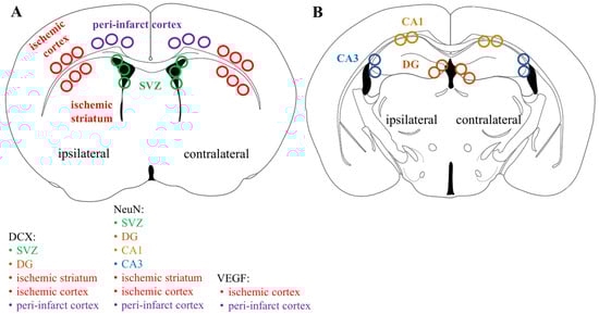 Figure 1 shows the regions of interest (ROIs) used in the study. The ROIs were defined in the ischemia-affected cortical and striatal areas based on cresyl violet staining; these ROIs were equally mirrored to the contralateral hemisphere. Three consecutive slices per animal with a distance of 300 μm apart were selected, with the middle slice demonstrating the most pronounced ischemic lesion. The ROIs from the cerebral cortex were used for the VEGF and NeuN assessment, whereas the striatal ROIs were utilized for the detection of DCX. Homologous areas in the contralateral hemisphere and in sham-operated animals were used for quantification. Additionally, the DCX (DCX