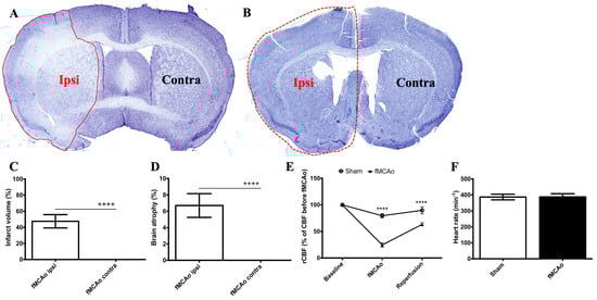 Coronal brain sections (30 μm thick) were cut using a freezing microtome (CM1850, Leica Biosystems, USA) and collected in 10 serial sections. Next, the sections were dehydrated with descending concentrations of alcohol, then cleared and stained with cresyl violet for 15 min. An investigator blind to the experimental groups performed the staining. The stained sections were digitized, and an image analysis was performed using ImageJ software (version 1.54f). Nissl staining was used to estimate the infarct area immediately following the fMCAo procedure and hemispheric atrophy 2 months after the fMCAo.