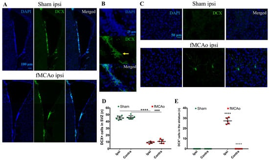 23]. Another study showed a similar increase in the neuroblast number in the ipsilateral, but not the contralateral, ischemic striatum 4 weeks after a 120 min MCAo. Notably, no changes in the number of differentiated neurons were observed in the peri-infarct zone in any of the groups. Shibahara et al. reported similar results 4 weeks after a permanent fMCAo in pericyte-deficient mice [