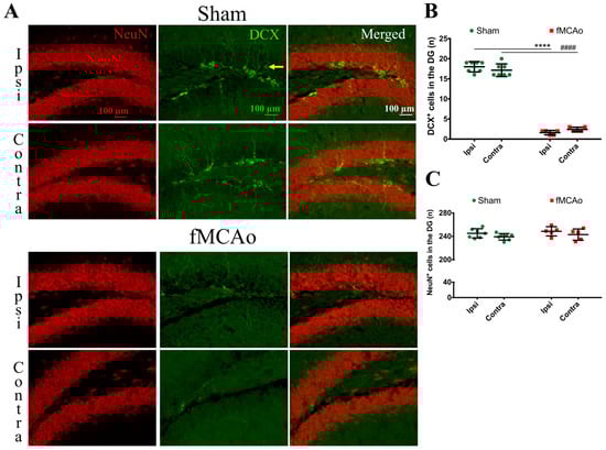 19]. We observed no differences in the formation of new neurons in the hippocampal DG between the sham and fMCAo groups in any of the studied hemispheres. Matsumori et al. also reported that, nine weeks after a 90 min MCAo, the level of neuronal differentiation in the DG was not significantly altered compared to sham-operated controls [