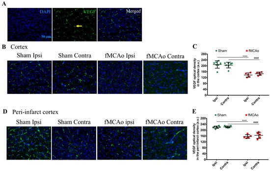 25]. However, the authors did not specifically compare the ipsilateral or contralateral hemispheres between sham and fMCAo animals. In a model of a permanent MCAo, Meng et al. observed an initial increase in VEGF expression in the rat ischemic penumbra for one week, followed by restoration to physiological levels two weeks after the fMCAo [