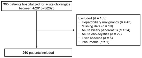 - An, Z.; Braseth, A.L.; Sahar, N. Acute Cholangitis: Causes, Diagnosis, and Management. Gastroenterol. Clin. N. Am. 2021, 50, 403–414. [Google Scholar] [CrossRef]