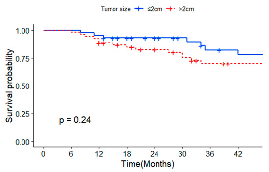 Figure 2 shows the Kaplan–Meier analysis of survival probability by tumor size. The 1-, 2-, and 3-year OS rates of patients with tumors < 2 cm were 89%, 86%, and 70%, respectively, whereas those of patients with tumors > 2 cm but <5 cm were 80%, 72%, and 57%, respectively. Tumor size did not significantly affect survival (p = 0.24).