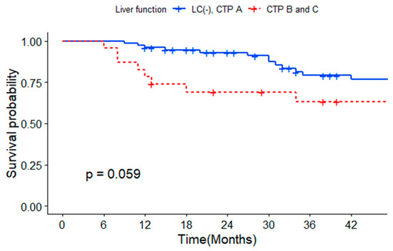 Figure 3 shows the Kaplan–Meier analysis of survival probability by liver function. The OS rates of patients without cirrhosis or cirrhotic patients with Child–Pugh class A disease at 1, 2, and 3 years were 91%, 87%, and 90%, respectively, while those of patients with cirrhosis and Child–Pugh class B or C disease at 1, 2, and 3 years were 78%, 69%, and 63%, respectively.